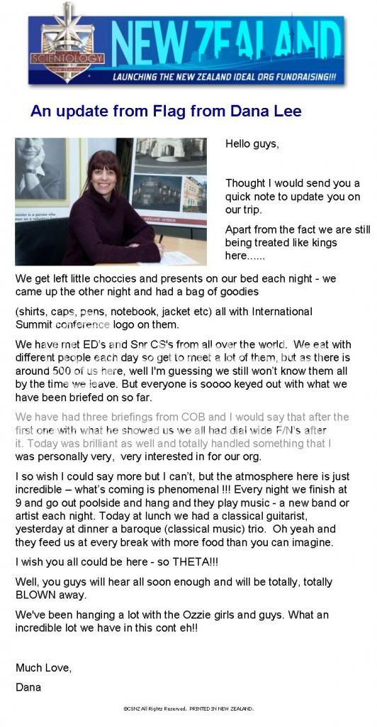 Ahhh, the warped mind of DM. Everyone is to co-audit and buy two meters!!! Sending the OOTs back home ASAP coincides with the kickoff of the co-auditing crusade, which starts with the E-meter sales campaign.Nah, don't be so cynical. Dana's not an OOT, she's attending the ED and Snr C/S Conference and that's just a good example of rallying the troops back home! She's an OL, lol.don't ya love the "making amends" part of liability? Yeah, I'm cynical, but that kinda is what it looked like. Everybody else on full-time training was too busy busting their ass... you promo like this, you were either in lowers or acting PTS and had to prove yourself. Sometimes 'OLs' got called out for this sort of thing, but not the norm....